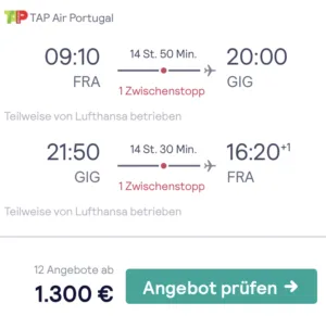 Für nur 1.300 Euro geht es bis Jahresende nach Brasilien und das ganz ohne Tricks. Denn der Flug startet direkt ab Frankfurt und führt mit der Fluggesellschaft TAP über Lissabon nach Rio de Janeiro. Dabei sparst du auf einen Schlag über 1.500 Euro gegenüber den Normalpreisen ab Deutschland.