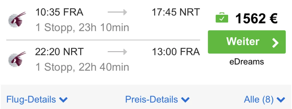 dabei startest du direkt ab Frankfurt und fliegst mit Qatar über Doha nach Tokio.